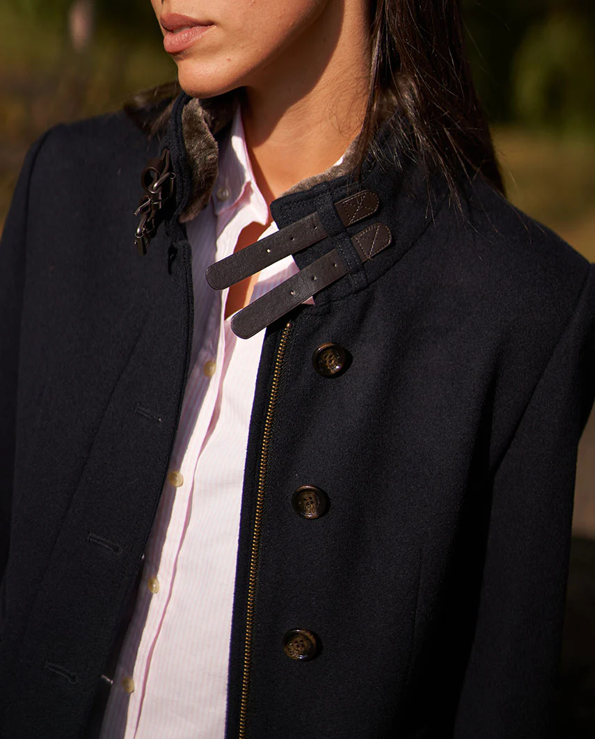 Die leicht ausgestellte Silhouette unterstreicht die feminine Linie und sorgt für eine moderne, zugleich klassische Anmutung. Ein besonderer Blickfang ist der hochschließbare Stehkragen mit kuscheligem, ausknöpfbarem Webpelzbesatz. Zwei Schnallen in Lederoptik setzen dabei stilvolle Akzente und verleihen dem Design Charakter.